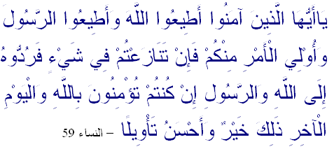 O you who believe! Obey All�h and obey the Messenger (Muhammad (saws)), and those of you (Muslims) who are in authority. (And) if you differ in anything amongst yourselves, refer it to All�h and His Messenger (saws), if you believe in All�h and in the Last Day. That is better and more suitable for final determination. [4:59]