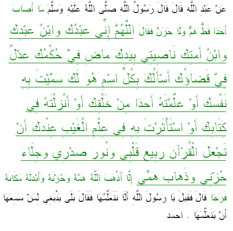 "There is no slave who, when he is stricken by anxiety and sorrow, says ‘O Allaah, I am Your slave and the son of Your male slave and female slave. My forelock is in Your hand (i.e., You have complete mastery over me ), Your command over me is forever executed, and Your decree over me is just. I ask You by every name belonging to You which You named Yourself with, or revealed in Your Book, or You taught to any of Your creation, or You have preserved in the knowledge of the Unseen with You, that You make the Qur'aan the life of my heart and the light of my breast, and a departure for my sorrow and a release for my anxiety ' - but Allaah will remove his sorrow and replace his grief with joy ." The people said: "O Messenger of Allaah, we should learn these words." He said: "The one hears them should learn them ."